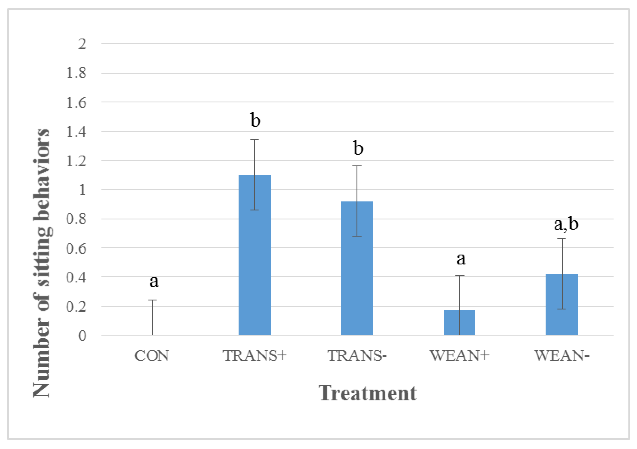 There was a significant treatment effect for sitting behavior (p < 0.01). Both TRANS+ and TRANS− treatment groups sat significantly more (p < 0.05) than the CON group (Figure 2). The WEAN+ treatment group spent a similar amount of time sitting as the CON group. WEAN− pigs spent a similar amount of time sitting as CON, TRANS+ or TRANS− treatment groups. The CON group did not spend any time sitting during the study. The WEAN+ treatment group spent 1% of their time sitting, while WEAN−, TRANS− and TRANS+ treatment groups spent respectively 2%, 4% and 5% of their time sitting.