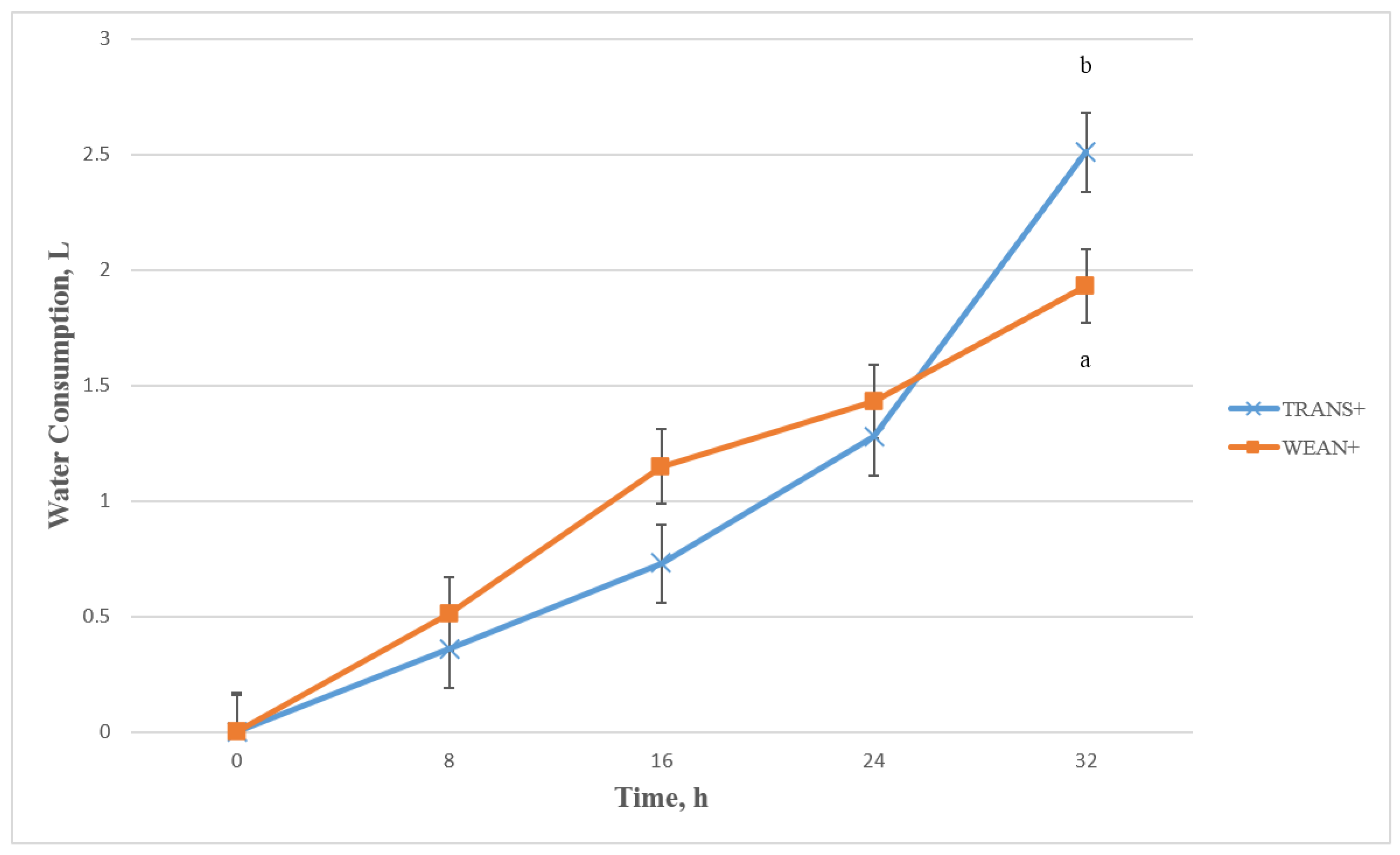 There was a significant treatment by time interaction for water consumption during the 32 h study period (p < 0.01). It is likely that water is spilled and wasted among weaned pigs. Water disappearance may be correlated with water consumption. Water disappearance did not differ between TRANS+ and WEAN+ treatment groups from 0 h to 24 h (Figure 3). However, after 24 h the TRANS+ treatment group drank significantly more water than the WEAN+ treatment group (p < 0.05), 2.51 ± 0.17 L and 1.93 ± 0.16 L by 32 h, respectively. Thus, water consumption increased in a linear fashion as time of transport increased.