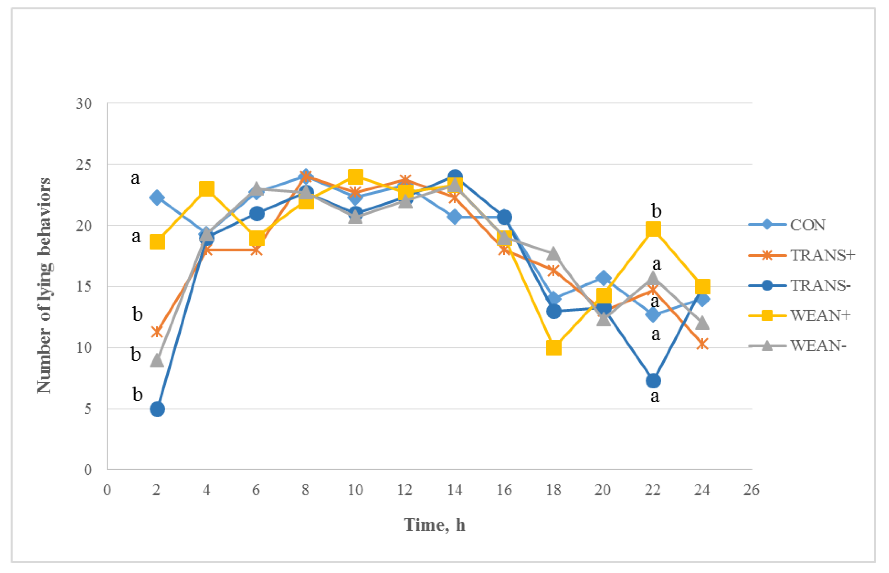 Overall, the CON group spent 65% of their time lying during the 32 h study period. TRANS+, TRANS−, WEAN+ and WEAN− pigs all spent over 75% of their time lying (TRANS+: 77%; TRANS: 81%; WEAN+: 81%; WEAN−: 87%).