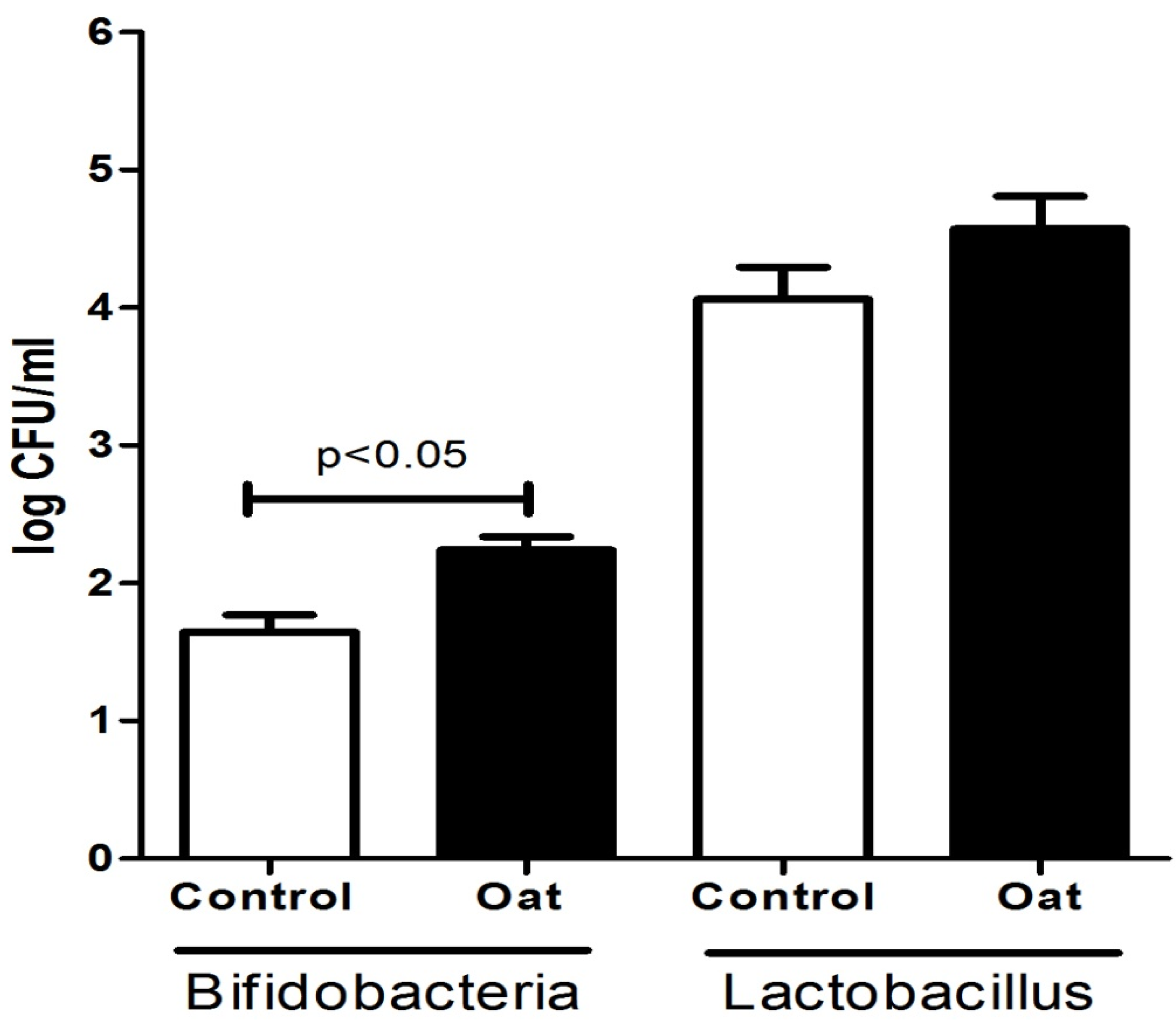 Plate counts on milk samples collected from sows that were fed oat had significantly higher levels of bifidobacteria compared to (1) control group (p < 0.05) (Figure 1). In contrast, we did not observe significant changes in Lactobacillus levels between the diet groups.