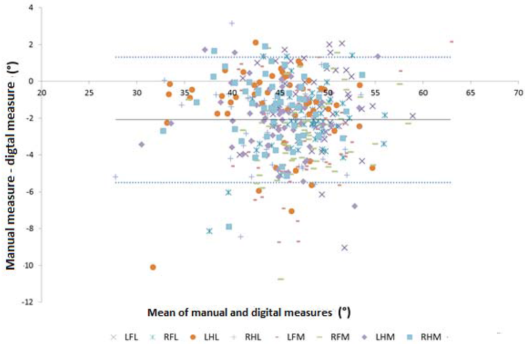 Figure 3. On average the manual measure was 2.1° smaller than the digital measure. This difference was not significantly associated with the mean of the two measures (R