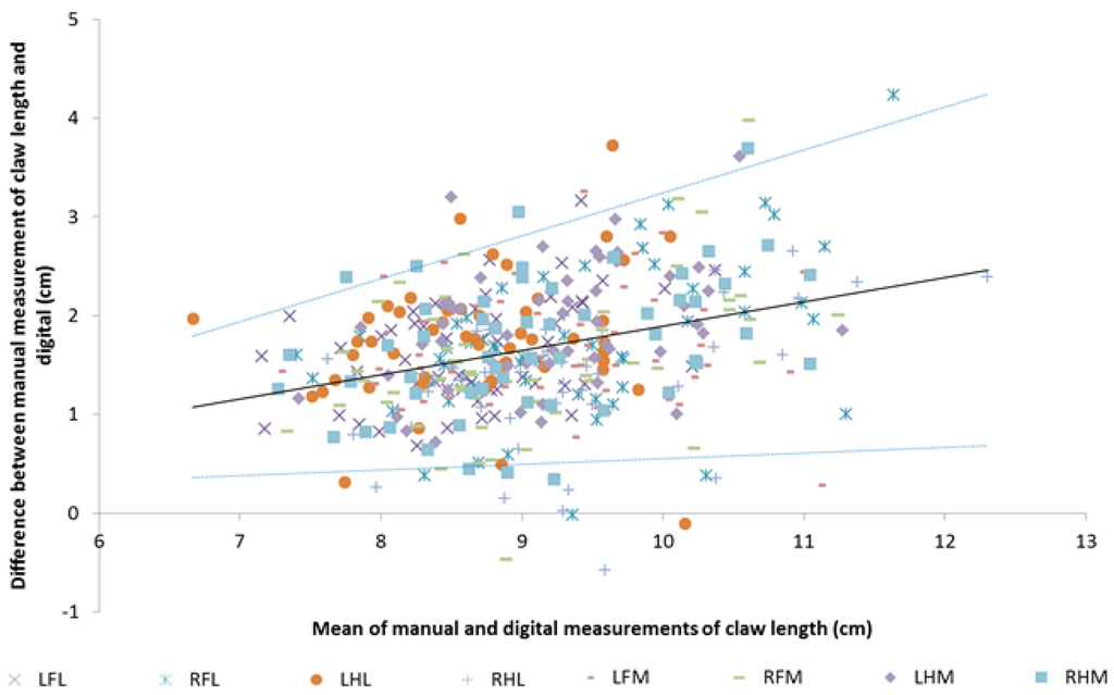 Claw, mean of the manual and digital measurement and their interaction were all significant in the mixed model (p < 0.020). The largest estimated marginal mean differences were recorded for the right front lateral claw and left front medial claws (0.82 cm and 0.73 cm, respectively). These differences were significantly larger than those recorded for both the claws on the right hind foot and the left hind lateral claw p ≤ 0.026). The regression of difference against mean was significant only for the lateral claws of the front feet (p ≤ 0.008). For both of these feet the association between mean and difference was strongly negative (slope of the regression line was −0.33 and −0.43, for left and right foot, respectively).