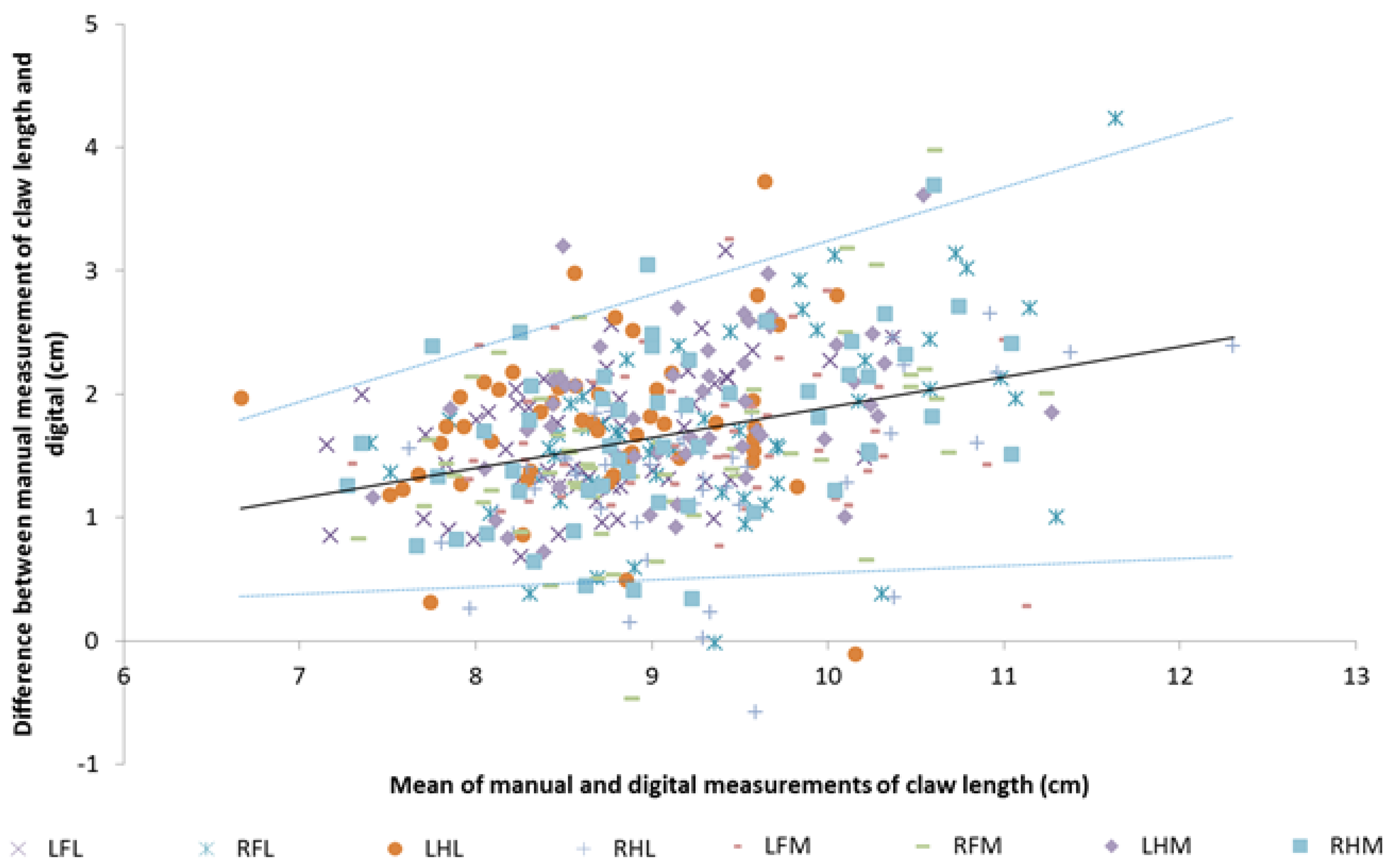 Claw, mean of the manual and digital measurement and their interaction were all significant in the mixed model (p < 0.018). The estimated marginal mean difference for the right hind lateral claw (1.37 cm) was the lowest mean difference and was significantly lower than that for all four claws from the left hand side (p ≤ 0.028). The regression of difference against mean was significant for all claws except for the left hind lateral and left front medial claws (p = 0.21 and 0.89, respectively). There was no significant difference between the regression equations for the remaining six claws (p > 0.01). The effect of claw on the variance of the difference between the two measures was almost significant at the 5% level (−2LL difference 48.2; df.18; p = 0.054); the standard deviation of the difference between the two methods was greatest for the left front lateral claw (0.78 cm) and lowest for the left hind lateral claw (0.53 cm).