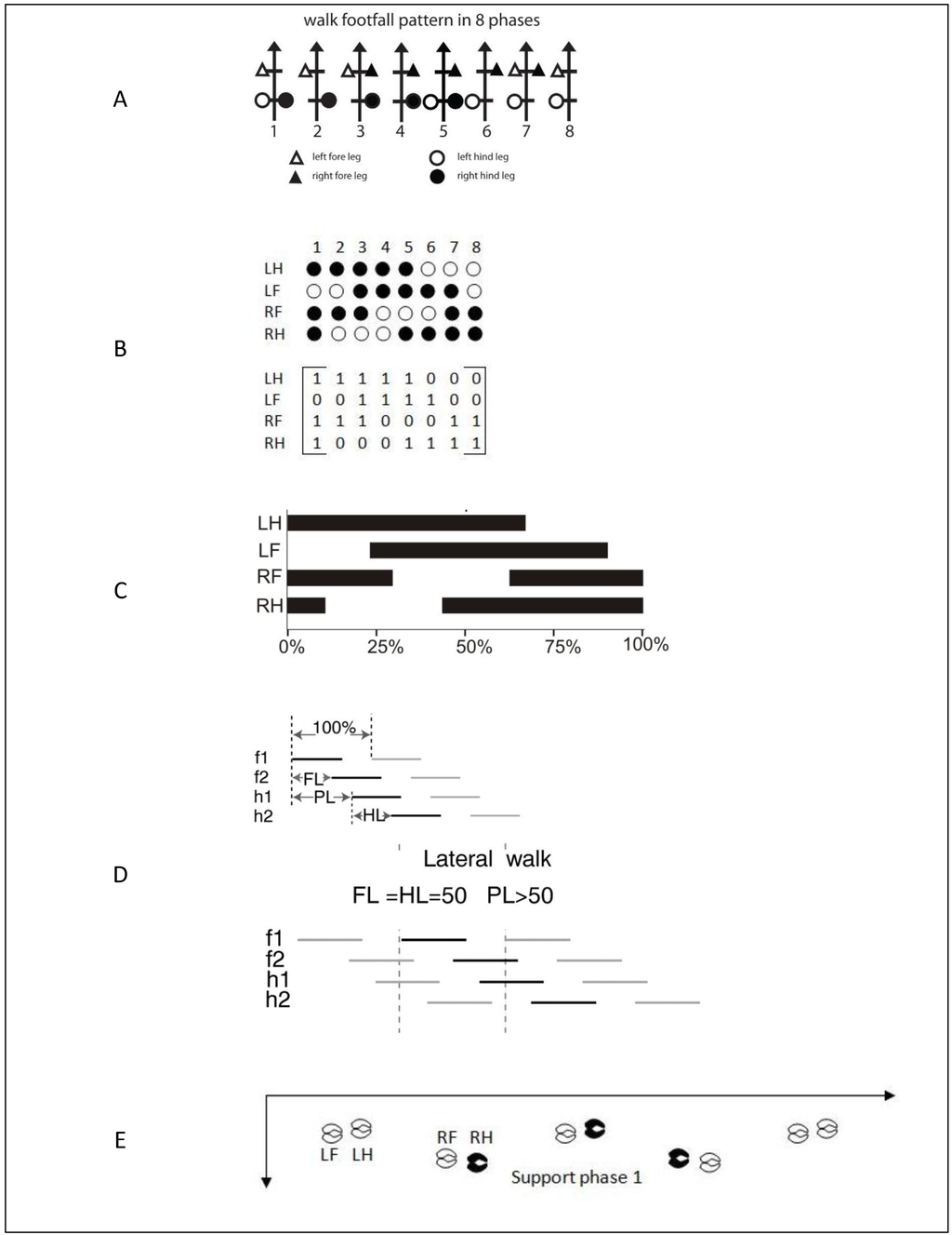 Schematic representation of quadruped gait: (A) footfall sequence formula according to Muybridge [21] with compact notation according to Hildebrand [20]; (B) gait matrix [22]; (C) gait diagram of a common lateral walk with additional temporal information [20]; (D) track-way diagrams revealing the use of the F-, H- and P-lag of Abourachid [23]; (E) spatial distribution of the supporting limbs [24].