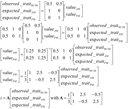 where i is the vector that contains the AM and PM values that will be used to build the equations to predict daily yield from AM or PM data for the trait considered and A is the matrix containing the coefficients used to combine observed studied_trait50/50 with the expected_traitAM or PM, these values being equal to b × milk_yieldAM or PM. The b coefficients for each studied traits were calculated based on regression analyses performed using Statistical Analysis System (SAS) software where the yield of the studied trait (calculated as content × milk yield) for the AM (PM) milking is the dependent variable and the milk yield observed after the AM (PM) milking is the independent variable.
