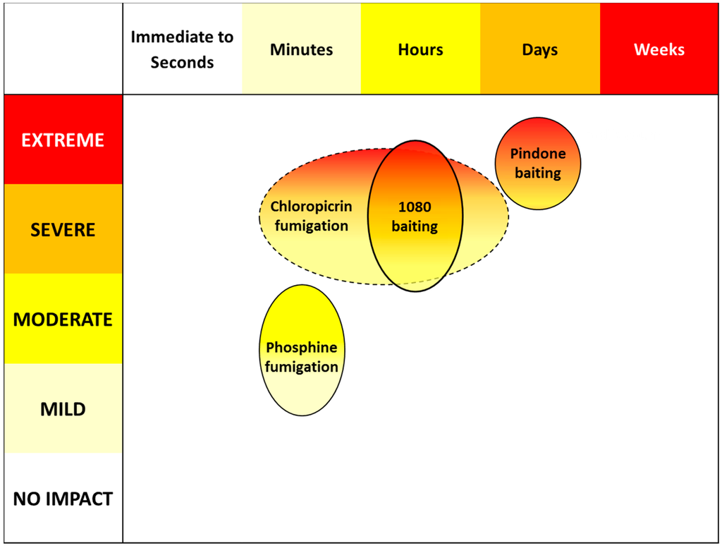 We present new data on behavioural responses of rabbits to pindone poisoning, in particular around the duration of welfare impacts and negative affective experiences. Application of this data to the welfare impact assessment framework substantially reduces the uncertainty in ranking of pindone as causing severe to extreme welfare compromise in rabbits primarily through functional impairments (Domain 3) that produce negative affective states (Domain 5), over a maximum duration of 7 days (Table 3). ‘Time to death’ was not an accurate metric of the duration of welfare impacts (Table 3): it took at least 6 days after ingestion of lethal quantities of pindone bait for rabbits to display observable signs of welfare compromise. The VTAs currently permitted for operational use for rabbit management in Australia and New Zealand include pindone and sodium fluoroacetate (1080) delivered as toxic baits and the burrow fumigants chloropicrin and phosphine. Based on rankings produced by [14], pindone has the highest welfare impact of these VTAs (Figure 1). Consistent with this ranking, other authors [25] have described pindone as inhumane in comparison to 1080 and some other rabbit control methods. We suggest greater utility of the term ‘animal welfare impact’ rather than ‘humaneness’ in this context because truly humane methods of pest animal management (i.e., lethal or non-lethal methods without welfare impacts) are considered rare (e.g., [14]).Relative rankings of impacts better accommodate comparisons between disparate control methods on a broader scope than the either/or binary implied by the terms ‘humane’ and ‘inhumane’.