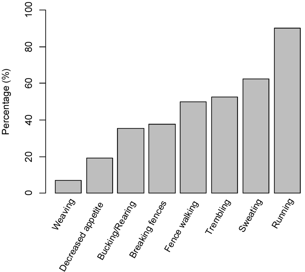 The majority of respondents (1104/1111) reported that their horse(s) had previously exhibited at least one of the behaviours, listed in Figure 1, in response to fireworks. Running (82%, 912/1107) was the most common behaviour reported, with no significant difference between property type (p = 0.412) or location (p = 0.068). There were a group of behaviours with similar frequencies reported (trembling, sweating and fence walking). Similar frequencies of these behaviours were reported across property location identifiers (urban, semi-rural, lifestyle or rural). Possibly as consequence of the high frequency of running, 35% (384/1107) of respondents reported having horse(s) break through fences in response to fireworks.