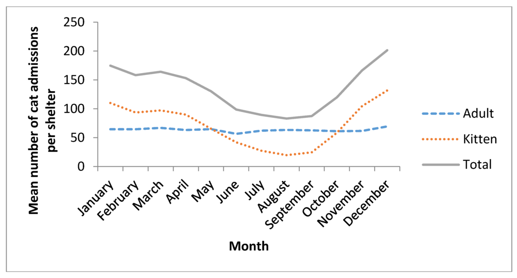 Our results also indicate that, while numbers of adult cat admissions remain constant throughout the year, kitten admissions vary seasonally, with a distinctive peak in kitten admissions between November and April (typically the warmer months in Australia). This was true even after accounting for the differences in the definition of kittens between states. Seasonal patterns with a peak in kitten admissions in the warmer months have been reported in other studies in the southern hemisphere [,,]. This is important information to consider for sterilization campaigns and social marketing messages, which may need to be intensified in cooler months (May through August) prior to the feline breeding season.