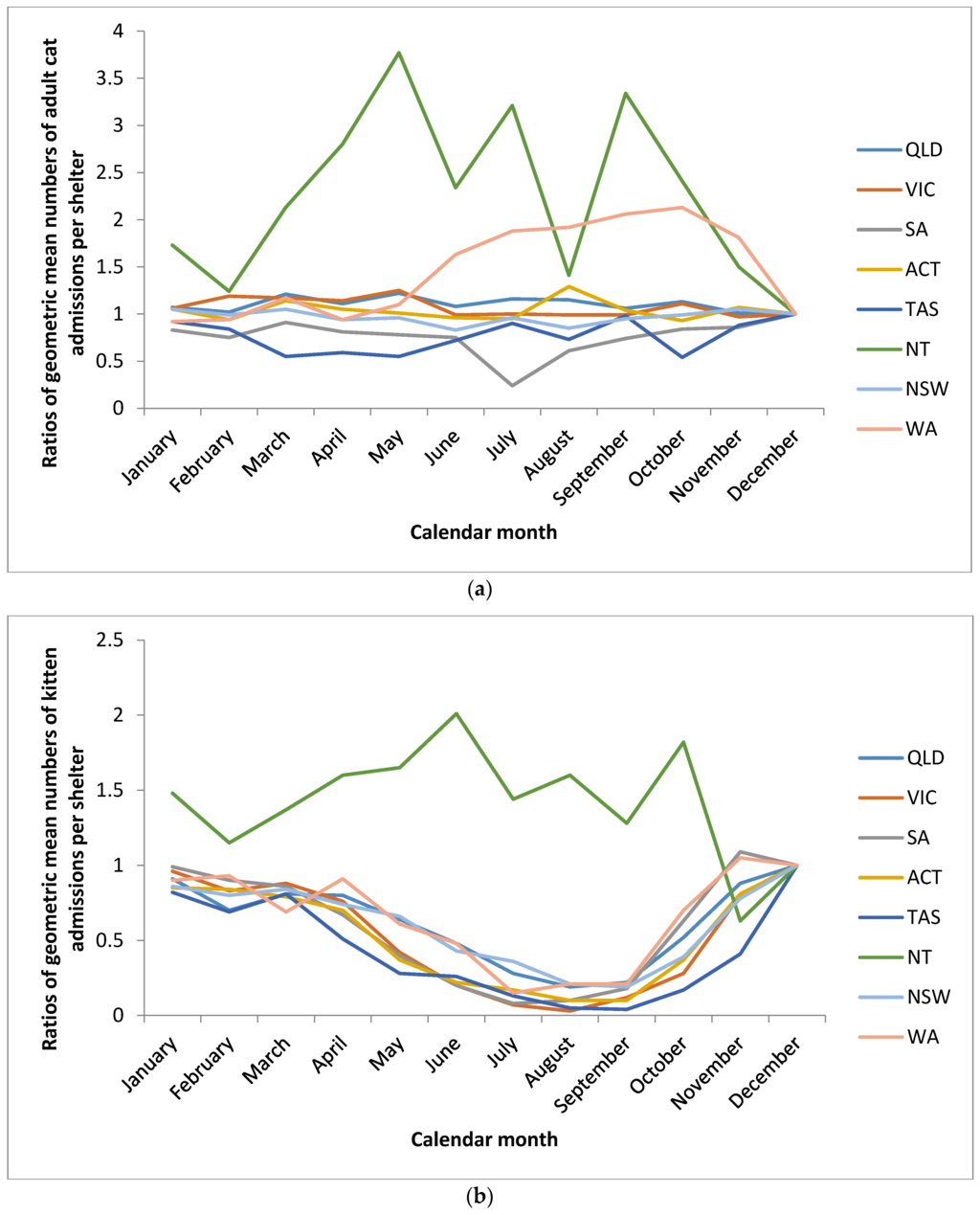 Ratios of geometric mean numbers of cat admissions per RSPCA shelter per month for January to November relative to December by state/territory. (a) Ratios of geometric mean numbers of Adult Cat admissions per RSPCA shelter per month for January to November relative to December by state/territory; (b) Ratios of geometric mean numbers of Kitten admissions per RSPCA shelter per month for January to November relative to December by state/territory. (Queensland (QLD), Victoria (VIC), South Australia (SA), Australian Capital Territory (ACT), Tasmania (TAS), Northern Territory (NT), New South Wales (NSW), and Western Australia (WA)). * For example, in Northern Territory (NT), the geometric mean number of adult cat admissions per shelter in January was 1.7 times higher than that in December.