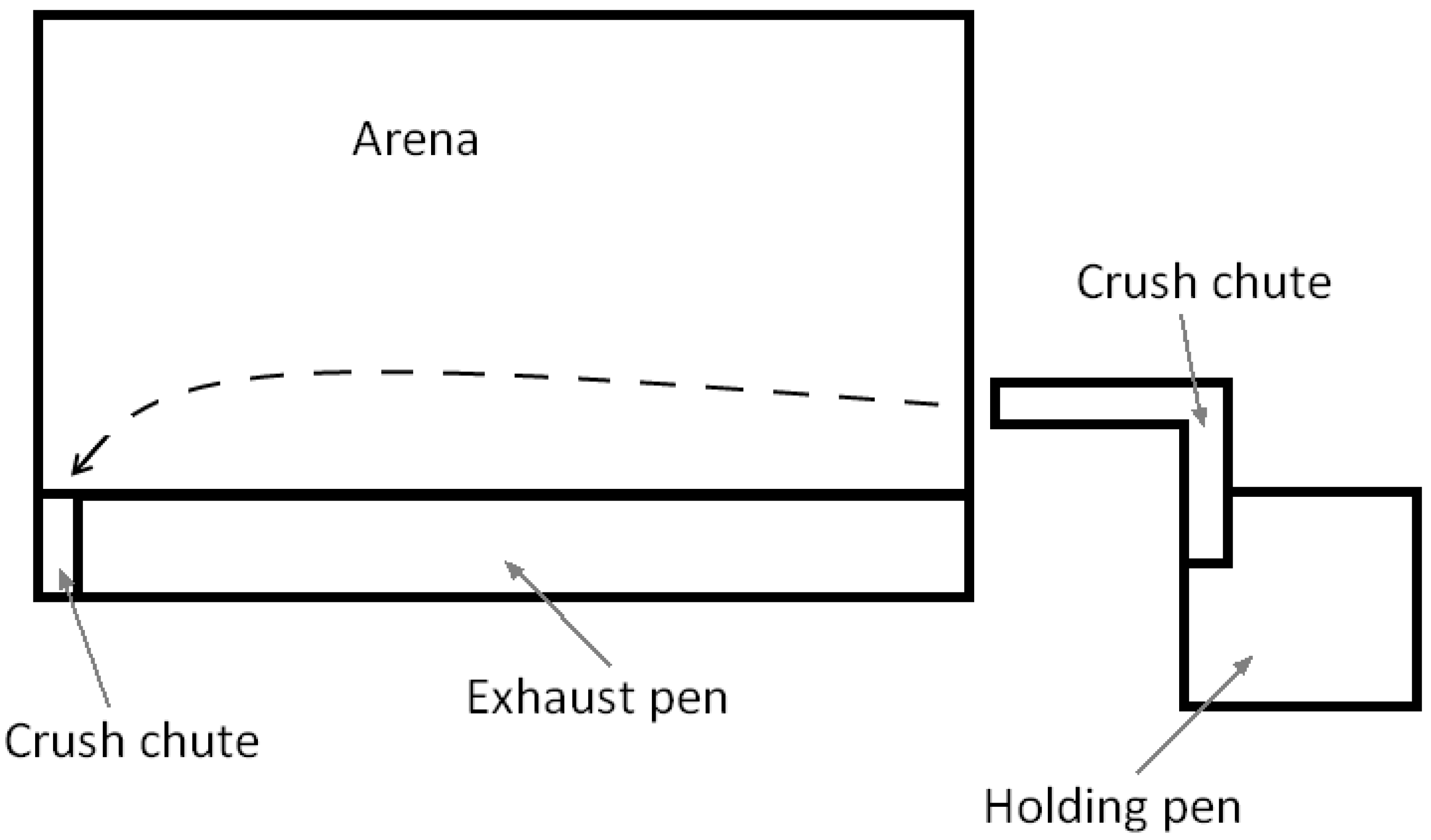 The facility was located at Destiny Downs (Emerald, Queensland, Australia) and included a 90 by 55 m rodeo training arena with leveled sand substrate (Figure 1). A holding pen was located at one end, joined to a chute for leading calves individually out of the pen to ready them for release into the arena. At the opposite end of the arena was another crush and gate through which calves could exit the arena via an exhaust pen. This followed a fenced path back alongside the arena into the holding pen or a paddock. The facility design allowed for 3–5 calves to be in the chute at any time, with the calf at the front moved into a crush that could be manually closed behind it to prevent it backing out or other calves entering the arena when the crush was opened. On release of the crush the calf was free to move forward into the arena.
