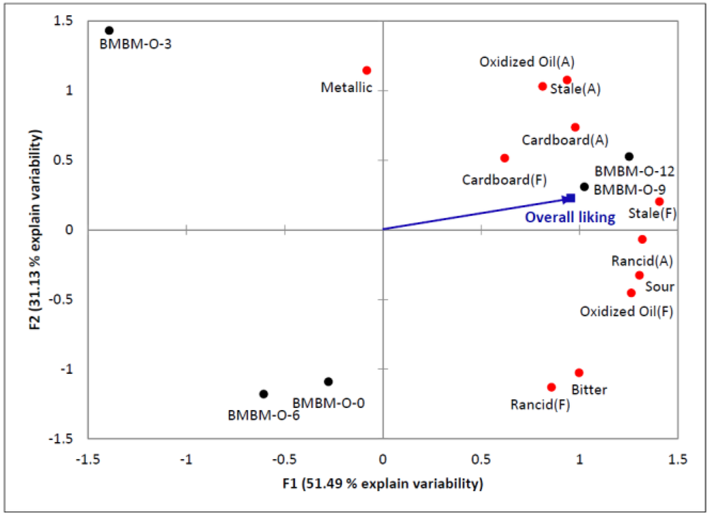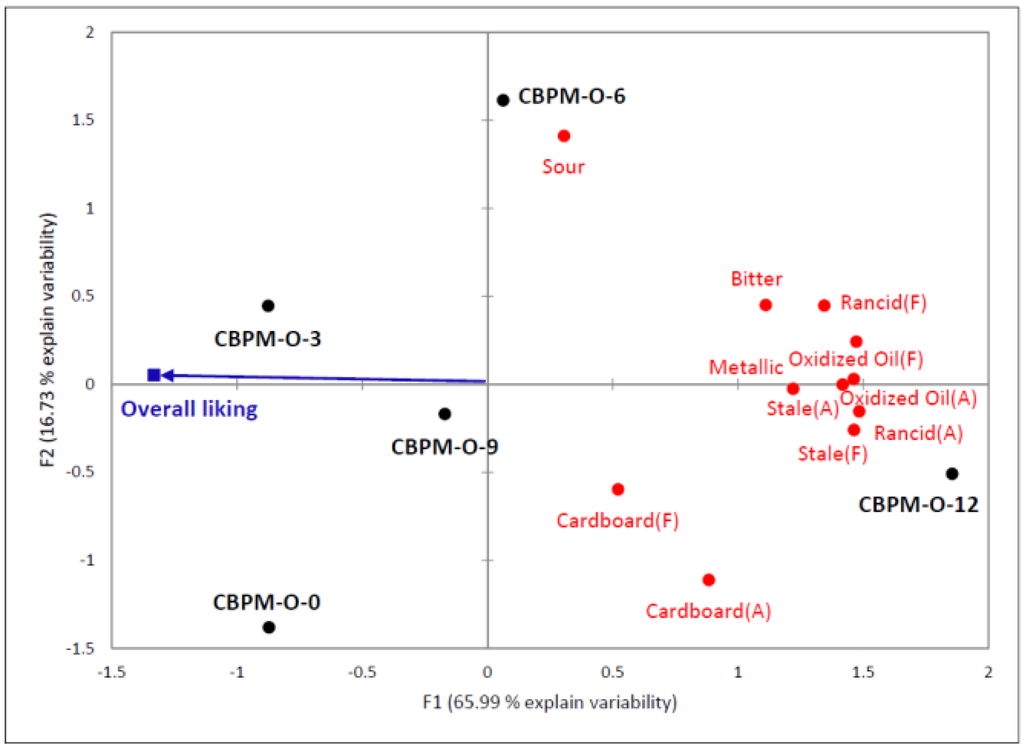The external preference mapping in Figure 2 showed that CBPM-O samples with lower intensities in off-note characteristics seemed to be preferred by pet owners. The descriptive sensory data showed the dramatic increase in off-note characteristics, especially oxidized oil and rancid attributes (p ≤ 0.05). The increase in off-note intensity in samples kept for 12 months was high enough for consumers to detect the differences. Moreover, these intensities tended to exceed their acceptability and this resulted in significantly lower liking scores for the samples kept for 12 months.