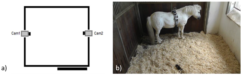 Ten horses of different breed, age, and gender (Table 2) were admitted to the Havelland Equine Clinic between 2012 and 2014. During this period, all referred horses that presented acute laminitis with no prior treatment were included. After admission, the subjects were stabled in standard single boxes (4 × 3 m with an outside window) on wood shavings (German Horse Span Classic, German Horse Pellets, Wismar Germany), and in visual contact with conspecifics. Two High Definition Cameras (Panasonic, HDC-SD99, Panasonic, Japan), were placed orthogonally on the top of the grate section on opposite sides of the box and allowed for video-recording of the behaviour and face of the horse without interfering with their normal behaviour (Figure 1).