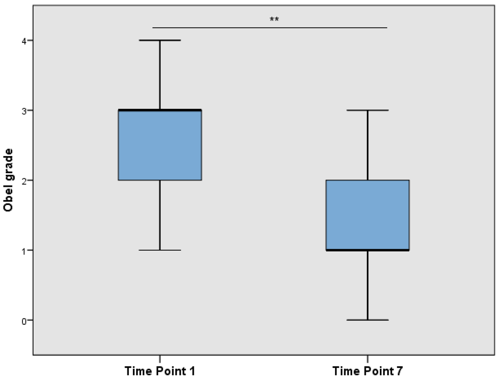 Obel grade over time drawn in a box plot (** p < 0.001).