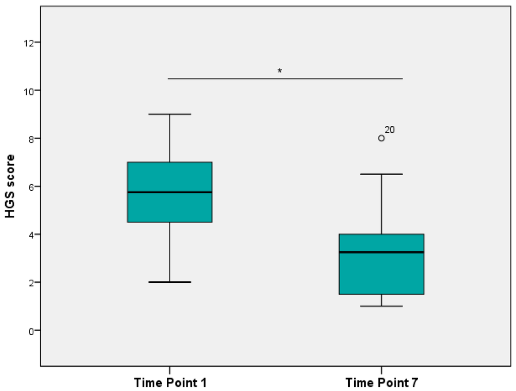 The average total HGS score from images at TP1 was 5.8 ± 2.0 (mean ± SD) and decreased significantly to 3.5 ± 2.3 (mean ± SD) at TP7 (Wilcoxon’s signed rank test, p < 0.01) (Figure 3).