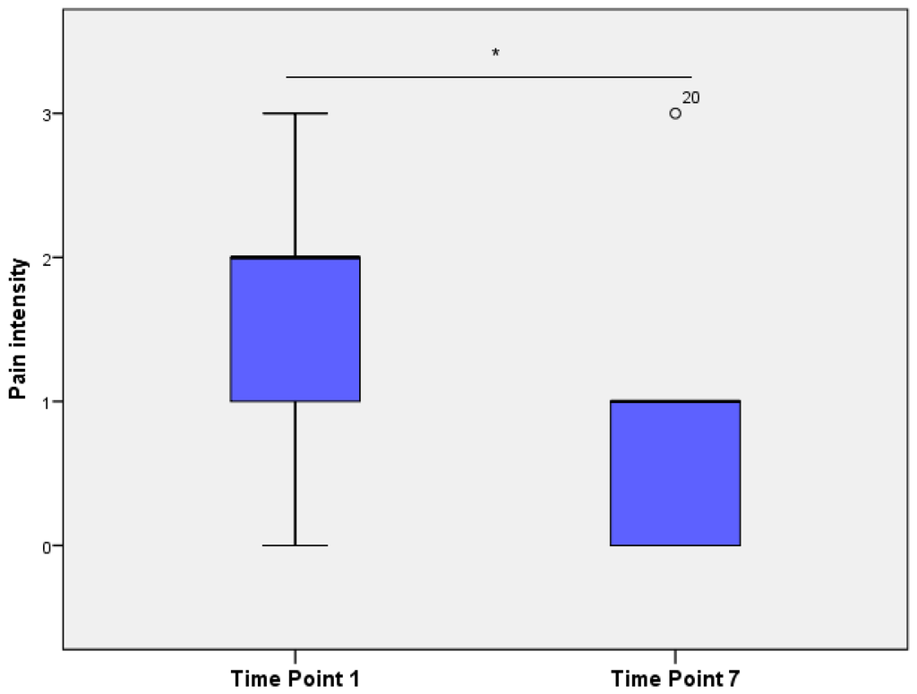 Pain intensity (descriptive pain scores), derived from images by four trained observers over time, drawn in a box plot (* p < 0.05). Outliers (1.5 to 3 times length of the box), labelled with the individual case numbers, are graphed as circles.