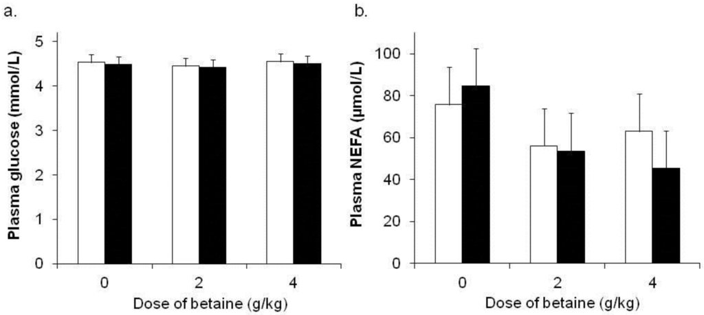There was no effect of environmental temperature (p = 0.49) or dietary betaine (p = 0.95) on plasma glucose concentrations (Figure 2a). However, there was an effect of day on plasma glucose (p = 0.008) such that concentrations decreased with experimental day (data not shown). Plasma glucose concentrations were not influenced by an interaction between temperature, dietary betaine and sample day (p = 0.43). There was no effect of environmental temperature (p = 0.66) on plasma NEFA concentrations, whereas plasma NEFA were decreased by dietary betaine treatment (80, 55 and 54 μmol/L for 0, 2 and 4 g betaine/day, respectively; p = 0.05, Figure 2b). There was an effect of day on plasma NEFA such that plasma NEFA were greater (p = 0.004) on day 19 (the last day of sampling) than they were on previous days although there was no consistent pattern (i.e., there was not a consistent decrease across sample days) and plasma NEFA concentrations varied with sample day (data not shown). Plasma NEFA concentrations were not influenced by an interaction between temperature, dietary betaine and sample day (p = 0.52).