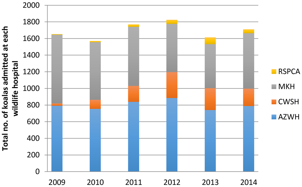 Approximately 10,000 koalas were admitted across the four wildlife hospitals throughout the six-year study period, with approximately 1600 admitted per annum. The largest intake of koalas was seen during 2012, where over 1800 animals were admitted (see Figure 1).