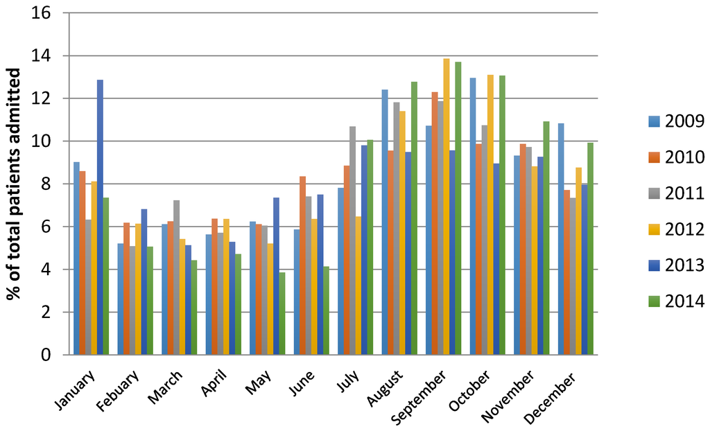 Figure 2 displays seasonal trends of koalas admitted to the four wildlife hospitals between 2009 to 2014, including annual proportions as well as monthly contributions.