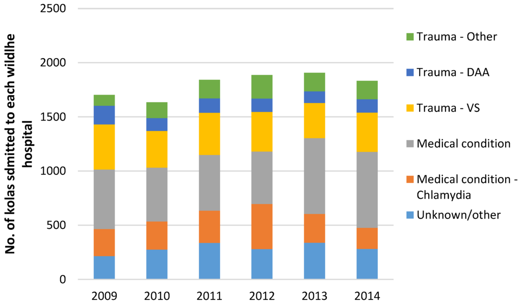 Most causes of admission, including vehicle strikes appeared to remain relatively consistent throughout the study period, with some instances including domestic animal attacks even decreasing over time. However, chlamydiosis appeared to increase in prevalence from 2009 to 2012 followed by a steady decline from 2013 to 2014 (see Figure 3).