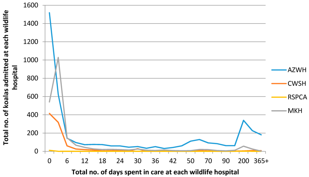 The time the koalas spent in care at each wildlife hospital (see Figure 4) indicates that most were in core care (the basic, first level of treatment including diagnosis a patient receives upon admittance) less than one week. The increase seen between days 150 and 365+ is largely an artefact of the change in the x-axis scale, but does indicate that some koalas did spend an extended amount of time in care, particularly at AZWH.