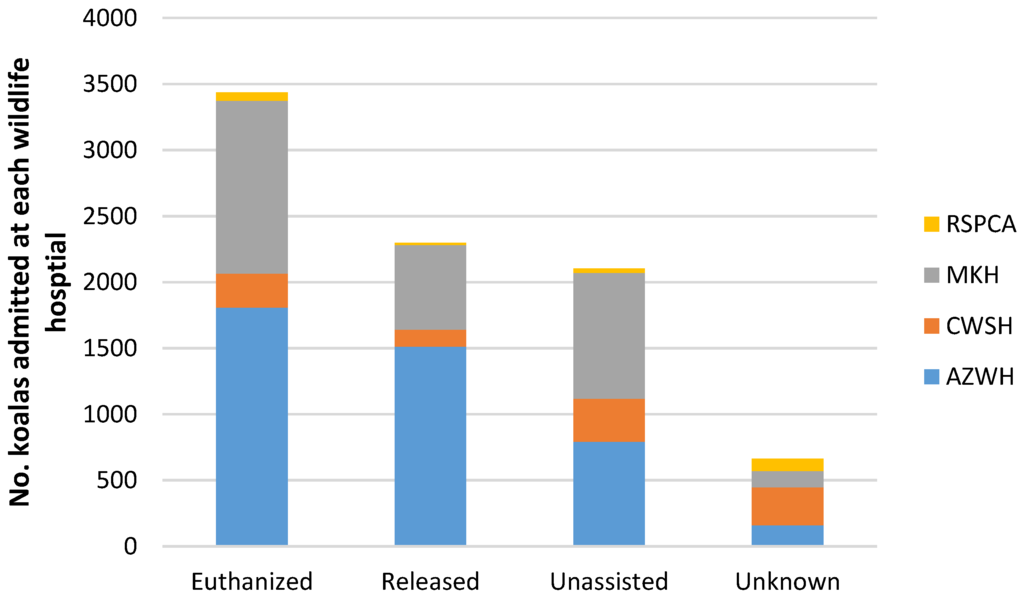 Almost two thirds of koalas (65.5%) which came into care were either euthanized or died, while 27% were able to be released. In total, 3437 koalas were euthanized by the four wildlife hospitals, representing 40% of the total admitted. Comparatively, 2297 (27%) koalas were released back into the wild throughout the study period.