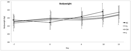 Mean (±SD) bodyweight (kg) of Bos indicus bull calves from −7 (7 days prior to surgery) to 13 days after surgery. NC = no castration, CL = castration with lidocaine, CM = castration with meloxicam, C = castration without analgesia.