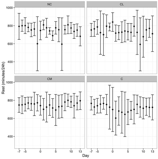 Mean (±SD) rest (min/24 h) from −7 days prior to surgery to 13 days after surgery. CL = castration with lidocaine, CM = castration with meloxicam, C = castration, NC = no castration.