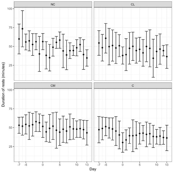 Mean (±SD) duration of rests (average time spent resting (minutes)) from −7 days prior to surgery to 13 days after surgery. CL = castration with lidocaine, CM = castration with meloxicam, C = castration, NC = no castration.