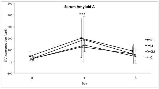 Mean (±SD) concentration of Serum Amyloid A (SAA) in serum (μg/L) of Bos indicus bull calves before and after surgical castration. NC = no castration, CL = castration with lidocaine, CM = castration with meloxicam, C = castration without analgesia. *** p < 0.001 difference in all groups from day 0 to day 3.