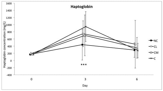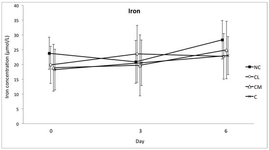 The mean serum concentrations of SAA and haptoglobin increased in all of the groups from the baseline (day 0) to day 3. This increase was significant (p < 0.001), but there was no difference between the groups (Figure 4 and Figure 5). The concentration of fibrinogen increased significantly in all of the groups from the baseline (day 0) to day 3 (p < 0.0001). The magnitude of this change was different between the groups (p = 0.0003), with the lowest plasma concentration of fibrinogen in the NC group on days 3 and 6 (Figure 6). The serum concentration of iron was not different between the groups or within the groups over time (Figure 7).