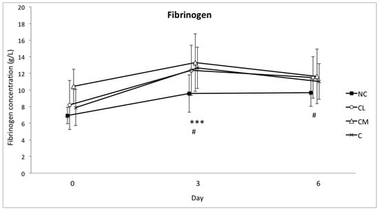 Mean (±SD) concentration of fibrinogen in plasma (g/L) of Bos indicus bull calves before and after surgical castration. NC = no castration, CL = castration with lidocaine, CM = castration with meloxicam, C = castration without analgesia. *** p < 0.001 difference in all groups from day 0 to day 3 and between groups on day 3. # p = 0.0003 the plasma concentration of fibrinogen was lowest in the NC group on days 3 and 6.