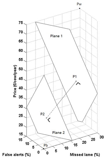 Schematic representation of the combination of system characteristics of the desired system. Pw represents the combination of characteristic levels for the system considered worst, with 30% missed lame cows, 15% false alerts, and a cost of €75/cow/year. Pb represents the system that is considered best, with 0% missed lame cows, 0% false alerts, and the lowest cost (€15/cow/year). P1 is the point representing the example current characteristic levels with plane 1 containing all system characteristic combinations with utility equal to P1. Plane 2 contains all system characteristic combinations that have the desired utility, and from which the most feasible option can be selected. P2 represents the combination with the smallest possible alterations to the current characteristics needed to reach the desired utility value for a future system.