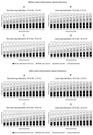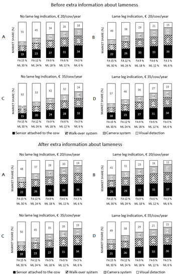 Simulated market shares (%) of the four detection systems after reducing the percentage missed lame cows (ML) and the percentage false alarms (FA) for four different situations before and after the farmer received extra information about lameness. (A) (situation 1), system cost €20/cow/year, no indication which leg is lame; (B) (situation 2), system cost €20/cow/year, indication which leg is lame; (C) (situation 3), system cost €35/cow/year, no indication which leg is lame; (D) (situation 4), system cost €35/cow/year, indication which leg is lame.