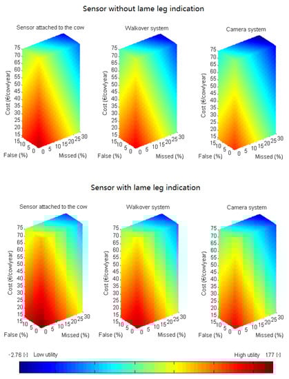 Using these visualizations, guidelines can be defined to indicate a direction to which further development should be focused to reach the desired result. An arbitrarily chosen example of a system that would benefit from improvement was used to demonstrate how such guidelines can be defined. A current system performance of 27% missed lame cows, 13% false alerts, a cost of €41 per cow per year, no lame leg identification, and a utility value of −1.20 was used as an example. Two example desired systems (i.e., improved versions of the example current system) were defined: the first system should have a utility value of 0, indicating that the system would incur equal usefulness compared to visual detection. The second system was defined by a utility value of 0.5. For each system, a combination of system characteristic levels that fulfills the prerequisites was defined for the case of a system attached to the cow. Both systems with and without lame leg identification were assessed for the future system configuration.