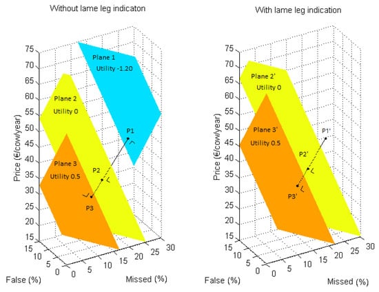 In Figure 5, the development goals to improve the example current system performance are presented visually for configurations with and without lame leg indication for the case of a sensor attached to the cow. Three points were defined: one representing the utility of the current system configuration (P1), one representing the system configuration for utility value 0 (P2), and one representing the system configuration for utility value 0.5 (P3), each lying within its respective plane of other combinations with equal utility values (plane 1, plane 2, and plane 3, respectively). Each combination of system characteristics (P2, P3) was found by determining the intersection point of the desired utility planes with the line through P1 (current system characteristics combination) perpendicular to plane 1. Hence, the combination of system characteristics that meets the desired utility with the smallest possible alterations (smallest spatial distance) to the current characteristic levels was found. The desired system performance with utility 0 was formed by a combination of 14% missed lame cows, 5% false alerts, and a cost of €36 per cow per year for a sensor system without lame leg indication (P2). The configuration for a system with utility 0.5 was 9% missed lame cows, 1% false alerts, and a cost of €34 per cow per year without lame leg indication. If the system could identify which leg was lame, the prerequisites for the other system characteristics became less strict. In this case, utility 0 was already reached with a system with 17% missed lame cows, 7% false alerts, and a cost of €37 per cow per year (P2′). Utility value 0.5 was obtained for 12% missed lame cows, 3% false alerts, and a cost of €35 per cow per year (P3′).