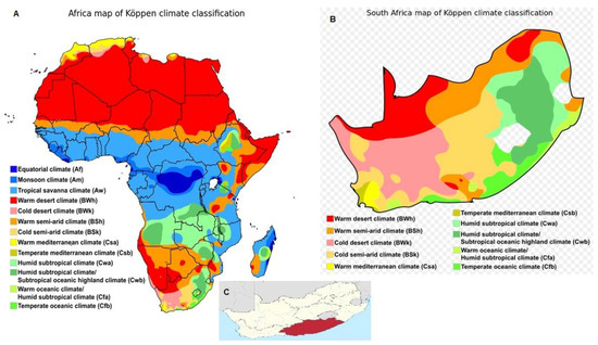 (A) Map of Africa of Koppen climate classification system; (B) Map of South Africa; (C) Map of the Eastern Cape Province (ECP) [27].