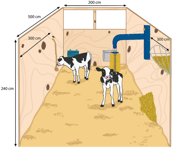 Eight pairs of calves (KiwiCross) were housed in identical pens. Seven pairs were mixed sex (i.e., one male and one female), and one pair was female. Within these pairs, one calf per pair was randomly selected for colour marking (Tell Tail paint, FIL NZ Ltd, Mount Maunganui, New Zealand) to distinguish between animals during video observation. From each pair, a focal calf (4 females and 4 males) was selected to ensure that sex was balanced (the first 4 pairs had a focal calf randomly selected and the sex of these dictated the focal calf selected in the other 4 pairs). At enrolment, focal calves weighed 54.0 ± 3.3 kg (mean ± SD). Exact age was available for only the females (11.5 ± 1.3 days old, mean ± SD); however, it was known that the males were born within the same week as the females. Pairs were housed in eight plywood enclosed pens (Figure 1) that provided 5 m2 per calf, that were bedded with wood shavings and contained a wall-mounted automated brush (mini swinging brush MSB, DeLaval, Sweden), a 1 m long rope attached to the pen wall opposite the brush (hemp-based manila rope, 28 mm, 3 strand, Action Outdoors Ltd, Auckland, New Zealand), and a small pile of straw, replenished every second day.