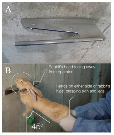 Cervical dislocation (CD) is another method commonly used for rabbit euthanasia [4]; however, it has been suggested that CD is inappropriate for rabbits weighing >1 kg due to their large neck muscle mass [6,9]. Various mechanical CD devices have been used in other species, such as poultry and mice [7,10]. To be humane, the device must cause a clean dislocation between the skull and first cervical vertebrae (C1), rupturing major blood vessels, as well as causing a rapid loss of sensibility [7,10]. These devices have not been evaluated in meat rabbits.