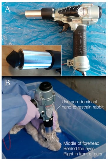 Livestock producers must have effective methods in place to euthanize sick, injured, and cull animals [1,2,3]. Few guidelines are available to assist meat rabbit producers in making on-farm euthanasia decisions, including recommendations as to which methods are most appropriate for different ages and sizes of animals. A recent survey of Canadian commercial meat rabbit producers established that the most common on-farm euthanasia method in use is blunt force trauma (BFT) [4]. BFT was used historically in Ontario abattoirs to stun rabbits for slaughter, but was discontinued in 2005 due to concerns surrounding efficacy and operator fatigue [5]. The American Veterinary Medical Association (AVMA) also encourages alternative methods to BFT because there is a large margin for error and operator fatigue, in addition to observer esthetic issues [6]. One possible alternative euthanasia method is the non-penetrating captive bolt device (NPCB) device, which is designed to deliver lethal brain trauma without penetrating the skin, reducing potential biosecurity and observer esthetic concerns. This device is used routinely for killing meat rabbits in Ontario abattoirs and has been validated for euthanasia of turkeys and piglets, with killing efficacy rates of 96% and 100%, respectively [7,8] For these indications, the device has been applied twice in rapid succession.
