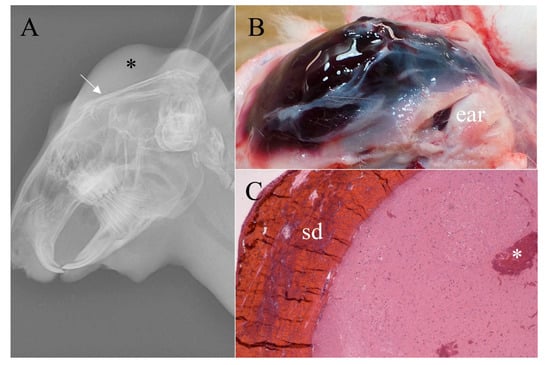 Eight week-old grower rabbit euthanized with the non-penetrating captive bolt device. (A) Survey radiograph demonstrating fractured and depressed cranium (arrow) and marked subcutaneous swelling and hemorrhage (*); (B) Skin reflected to demonstrate marked subcutaneous hemorrhage completely covering the area from the eyes to the base of the skull (gross score of 4/4); (C) Photomicrograph of midbrain demonstrating marked subdural hemorrhage (sd) (histologic score of 4/4) and moderate parenchymal hemorrhage (*) (histologic score of 3/4) (H & E, ×20).