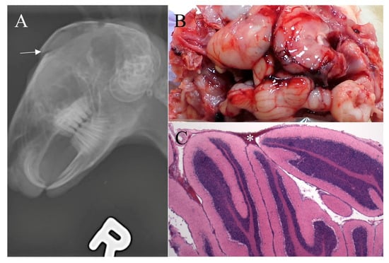 Six week-old grower rabbit euthanized by blunt force trauma. (A) Survey radiograph demonstrating fractured cranium (arrow); (B) Minimal subdural dorsal hemorrhage covers less than 25% of the brain surface (gross score of 1/4); (C) Photomicrograph of cerebellum (demonstrating mild subdural hemorrhage (*) (histologic score of 2/4) and no parenchymal hemorrhage (histologic score of 0/4). No subdural or parenchymal hemorrhage were noted in the midbrain. (H & E, ×20).