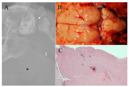 Eight week-old grower rabbit euthanized by mechanical cervical dislocation. (A) Survey radiograph shows a clean dislocation between the base of the skull and the first vertebrae (arrow) and marked cervical hemorrhage (*), t = trachea; (B) Grossly, no subdural dorsal hemorrhage was noted (gross score of 0/4); (C) Photomicrograph of midbrain demonstrating a lack of subdural hemorrhage (histologic score of 0/4) and minimal parenchymal hemorrhage (*) (histologic score of 1/4) (H & E, ×20).