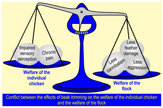 Beak trimming in chickens. This procedure reduces the consequences, but not the incidence, of severe feather pecking. Although it causes discomfort in the individual chicken, the flock may profit from this intervention because the consequences of feather pecking are generally less severe [33,37]. The general question thus is whether the harm inflicted on the individual outweighs the benefits for the individual and/or the group [2]. This figure shows, as a hypothetical example, the evaluation concluding that the effects of beak trimming are favorable for the welfare of the flock. Depending on a different weighing of the arguments, the conclusion may be that prophylactic beak trimming is unacceptable. For example, in breeds with a very low incidence of feather pecking, trying to reduce the suffering of some of the birds by mutilating all of them seems completely unacceptable from a purely animal welfare perspective, whereas in breeds with a very high incidence of feather pecking, beak trimming might be considered more acceptable. Alternative solutions to beak trimming must be taken into account before even considering the use of mutilating procedures.