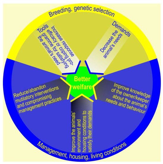Strategies for improving animal welfare (inspired by [110]). Improving the animal’s tools (abilities) to cope efficiently with its environment or decreasing the animal’s demands (needs) via breeding programs and genetic selection are goals of ongoing activities. In particular, the strategy of reducing the animal’s demands by using genetic selection procedures is subject to ethical discussions [112,113]. Alternatively, one may reduce or abandon mutilating procedures, improve the animal’s housing conditions, and improve the knowledge of owners/keepers/stockmen with respect to the animal’s needs and demands. In particular, with respect to management, housing, and living conditions, animal welfare scientists and veterinarians should deploy their expertise, give (un)solicited advice, and assume an active role in the welfare discussion (see also Figure 3).