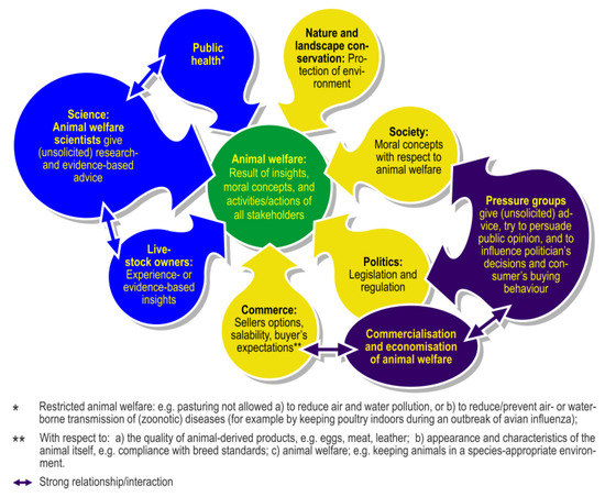 Stakeholders in animal welfare. Animal welfare is the result of (scientific) insights, of moral concepts of scientists and society at large [114,115,116], and of the activities and actions deployed by all stakeholders. Animal welfare scientists have an obligation to perform scientific research on animal health and welfare, to take action if animal welfare is compromised, and to give direction to future developments. Politicians are sensitive to the opinions and sentiments of pressure groups and society at large and may amend legislation and regulations. In parallel, the commercial value of animal welfare is increasingly being recognized and creates added value for many animal-derived products (e.g., [117]) and services. Note: Veterinarians are involved in ensuring public health, and they are the primary contact persons about animal health/welfare with livestock/animal owners.