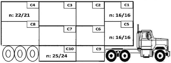 One data logger (High Resolution Thermochron iButton DS1921H, Maxim Integrated Products, Inc., Sunnyvale, CA, USA) was mounted on the ceiling of each selected compartment in a central location to provide information about the temperature and relative humidity inside the compartments. The loggers were programmed to collect data at 5-min intervals throughout transport.