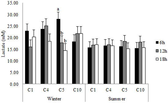 Blood lactate concentrations (LSM ± SEM) in pigs transported for 6, 12 and 18 h in the compartments C1, C4, C5 and C10 during winter and summer. a,b Least squares means without a common superscript differ (p < 0.05).