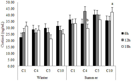 Blood cortisol value (LSM ± SEM) in pigs transported for 6, 12 and 18 h in the compartments C1, C4, C5 and C10 during winter and summer. a,b Least squares means without a common superscript differ (p < 0.05).