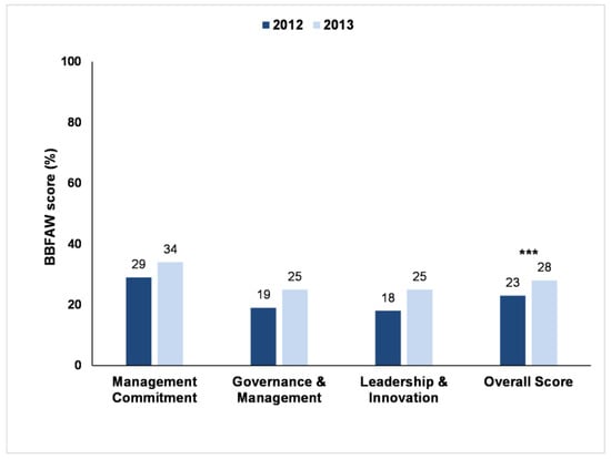 Business Benchmark on Farm Animal Welfare scores (as % of the total possible points) of 68 companies in 2012 and 70 companies in 2013. Average company scores for three core areas of the assessment and average overall company scores in both years. Statistical significance is indicated with *** (p < 0.001).