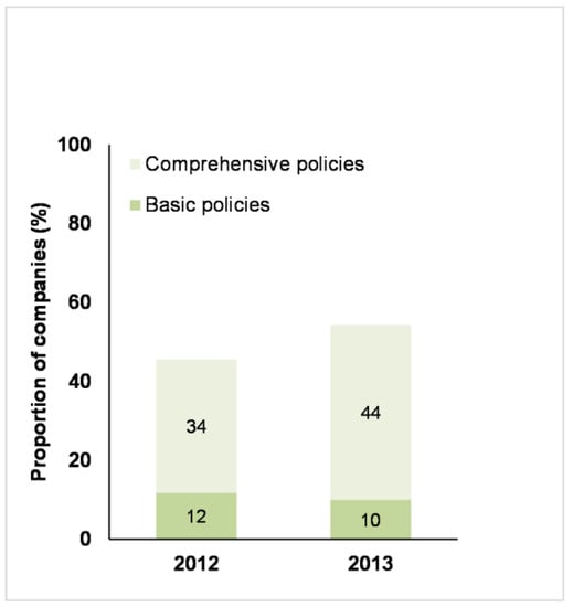 The Benchmark differentiated between companies that were considered to have a basic farm animal welfare policy (broadly defined as having a clear published statement of commitment to farm animal welfare and/or farm animal welfare-related principles, but providing limited information on how the policy was to be implemented) and those that published a comprehensive farm animal welfare policy. In order to be considered comprehensive, a farm animal welfare policy needed to include most or all of the following elements: a clear statement of the reasons why farm animal welfare is important to the business; a commitment to compliance with relevant legislation; a clear position with regard to expected standards of farm animal welfare; a description of the processes in place to ensure that the policy is effectively implemented; and a commitment to public reporting on performance [,]. The number of companies that had published (any) farm policies, increased from 2012 to 2013 (Figure 2), mainly due to an increase in companies publishing comprehensive farm animal welfare policies. Of the companies that had published comprehensive or basic farm animal welfare policies, 77% and 79% (for 2012 and 2013, respectively) applied these policies to all geographies; 58% and 68% (for 2012 and 2013, respectively) applied these policies to all relevant animal species and 48% and 45% (for 2012 and 2013, respectively) applied these policies to all products produced, manufactured or sold.